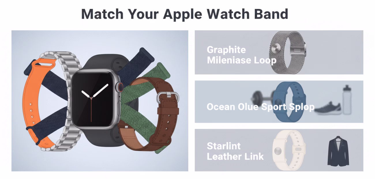 ➔ Match by Occasion & Size: Dress up your look with a Graphite Gray Milanese Loop for the office or keep things sporty with an Ocean Blue Sport Loop at the gym—just make sure it’s the right fit for your 41mm or 45mm Apple Watch.